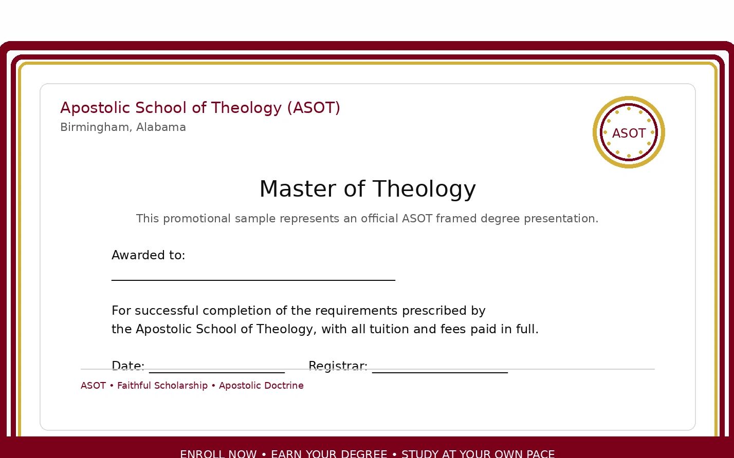 The image shown is a promotional sample of ASOT's framed degree presentation